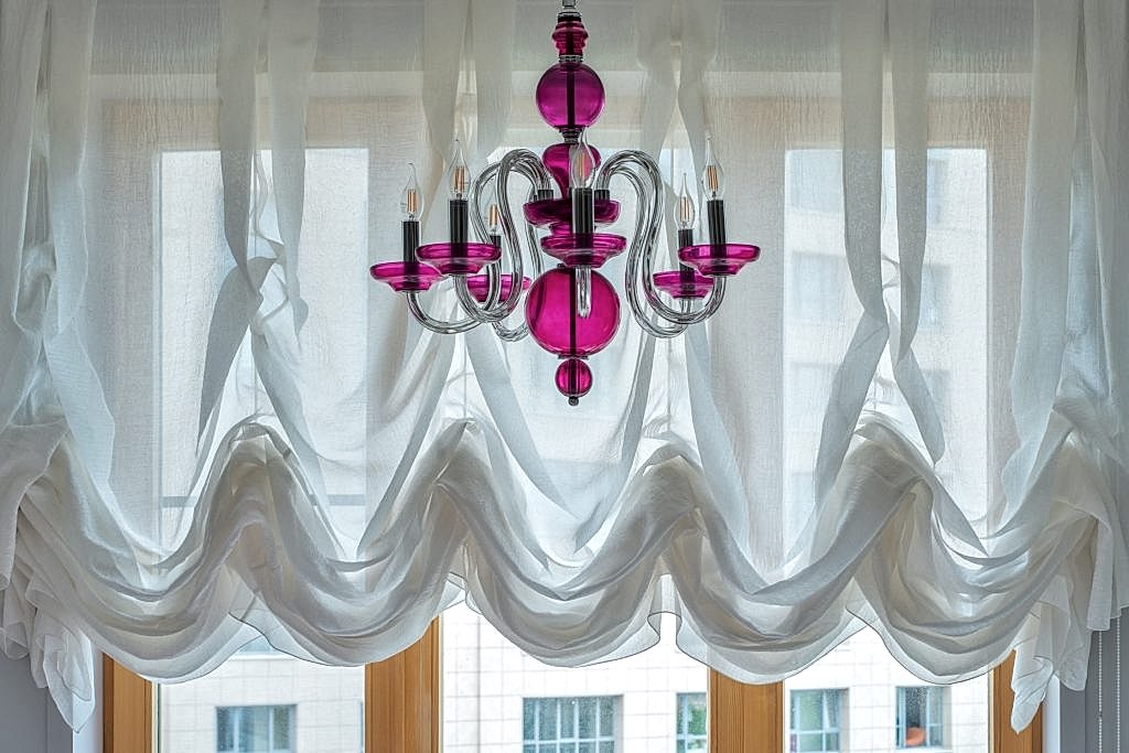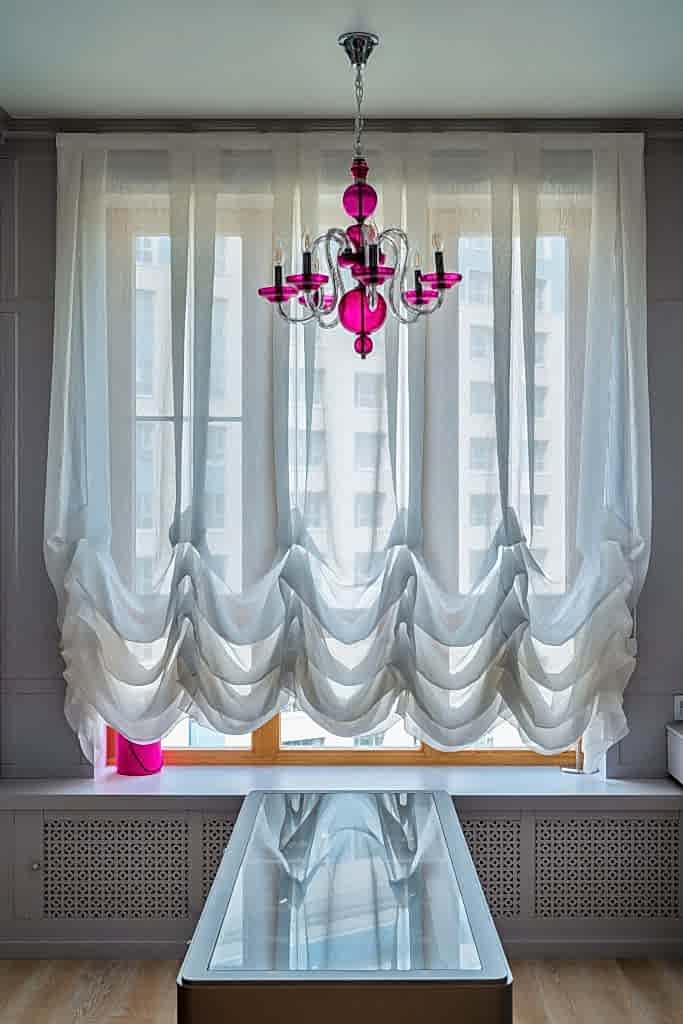 Занимаясь оформлением гардеробной комнаты, для декорирования окна мы выбрали лондонские шторы из легкой, воздушной ткани. Нарядные лондонские или английские Пин-ап - это вариант подъемных штор, особенность которых заключается в образовании горизонтальных складок-волн и боковых буфов, часто напоминающих банты или веера. Пышные и объемные, лондонские шторы выглядят изысканно, роскошно и элегантно. В тоже время, когда такие шторы опускаются и полностью раскрываются, они смотрятся сдержанно и строго.