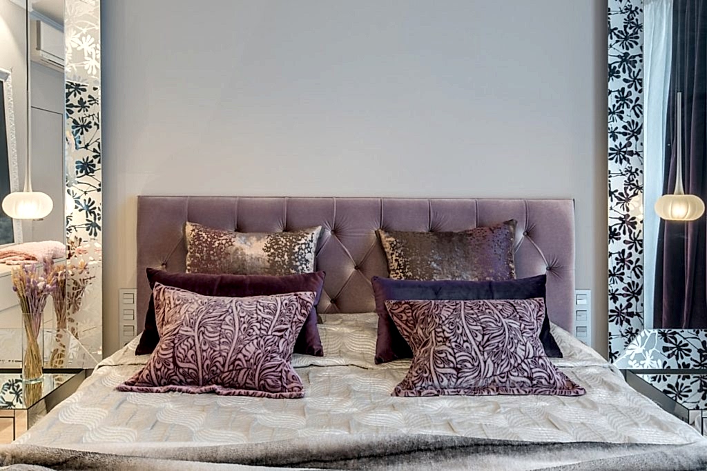 Оформляя спальню для нашей прекрасной, энергичной заказчицы, мы с особым трепетом подбирали каждую деталь текстильного оформления. Роскошные бархатные портьеры с кистевыми подхватами создают уютный, расслабляющий полумрак. Покрывало-основа из сложного жаккарда светлых оттенков оттеняет шесть бархатных подушек с различными орнаментами. Темный насыщенный оттенок портьер и подушек в сочетании со светлыми стенами и зеркальными вставками, отражающими свет из окна, создают завораживающий контраст!