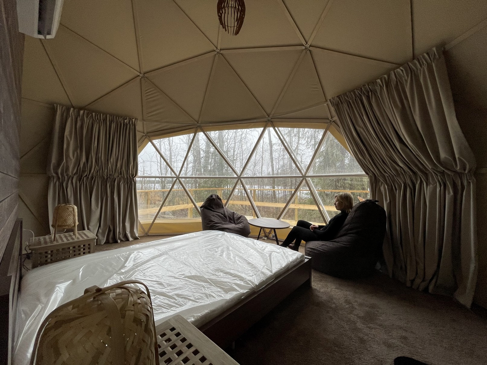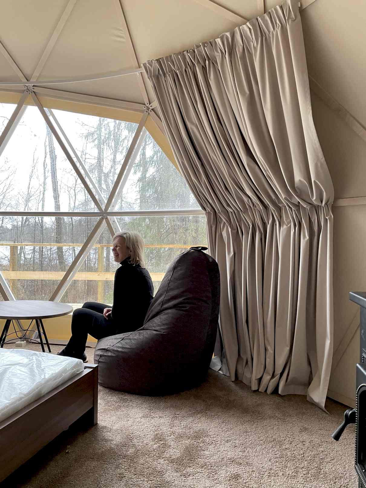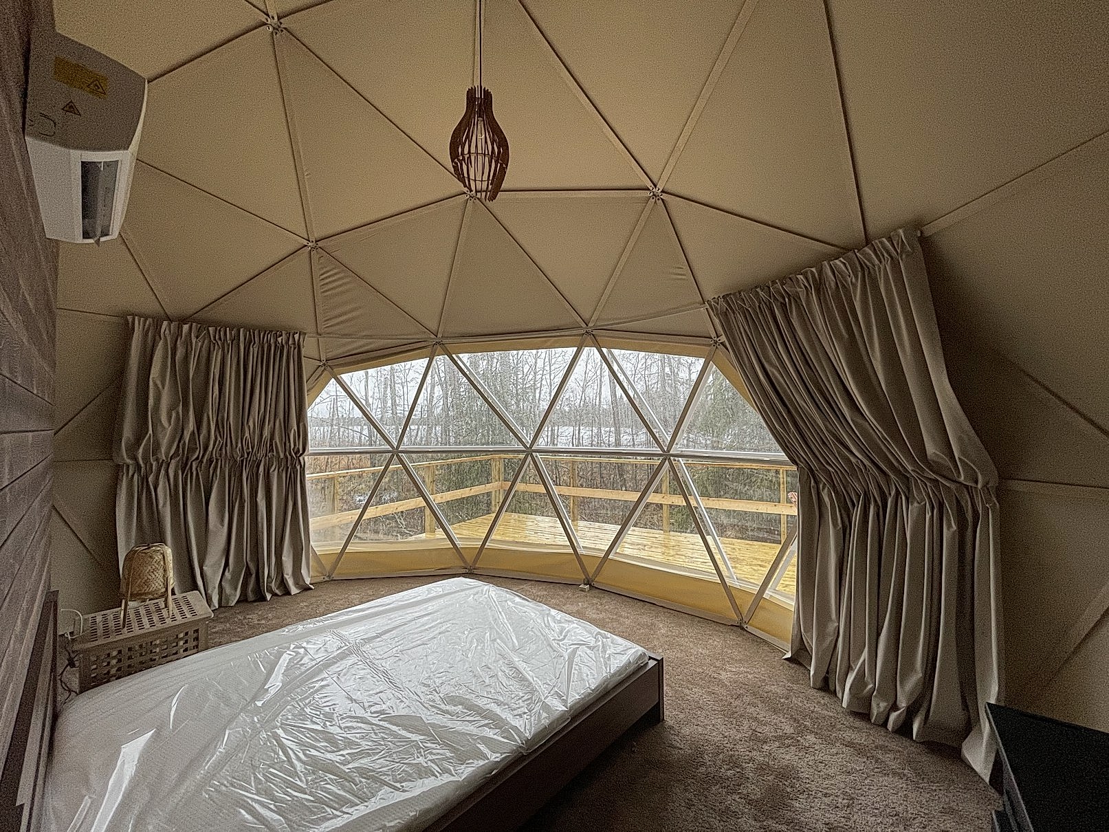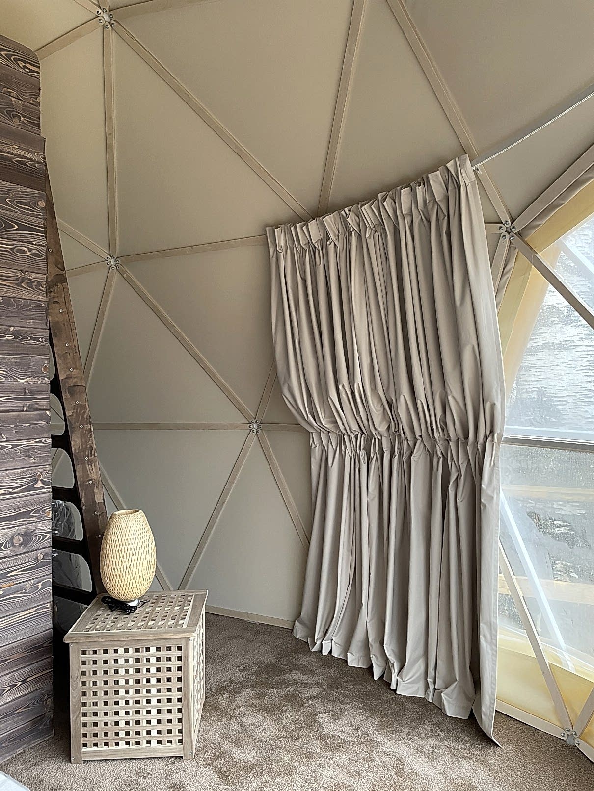 Этот опыт работы был интересен с точки зрения использования стандартных приёмов оформления окна при решения функциональных задач по организации отдыха гостей Пин-ап - светозащиты внутри дома и необходимое уединение для комфортного проживания. Для этих целей внутри дома-сферы использовали ткань блэкаут. Материал имеет противопожарный сертификат и изготовлен изспециального волокна 100% PES FR.