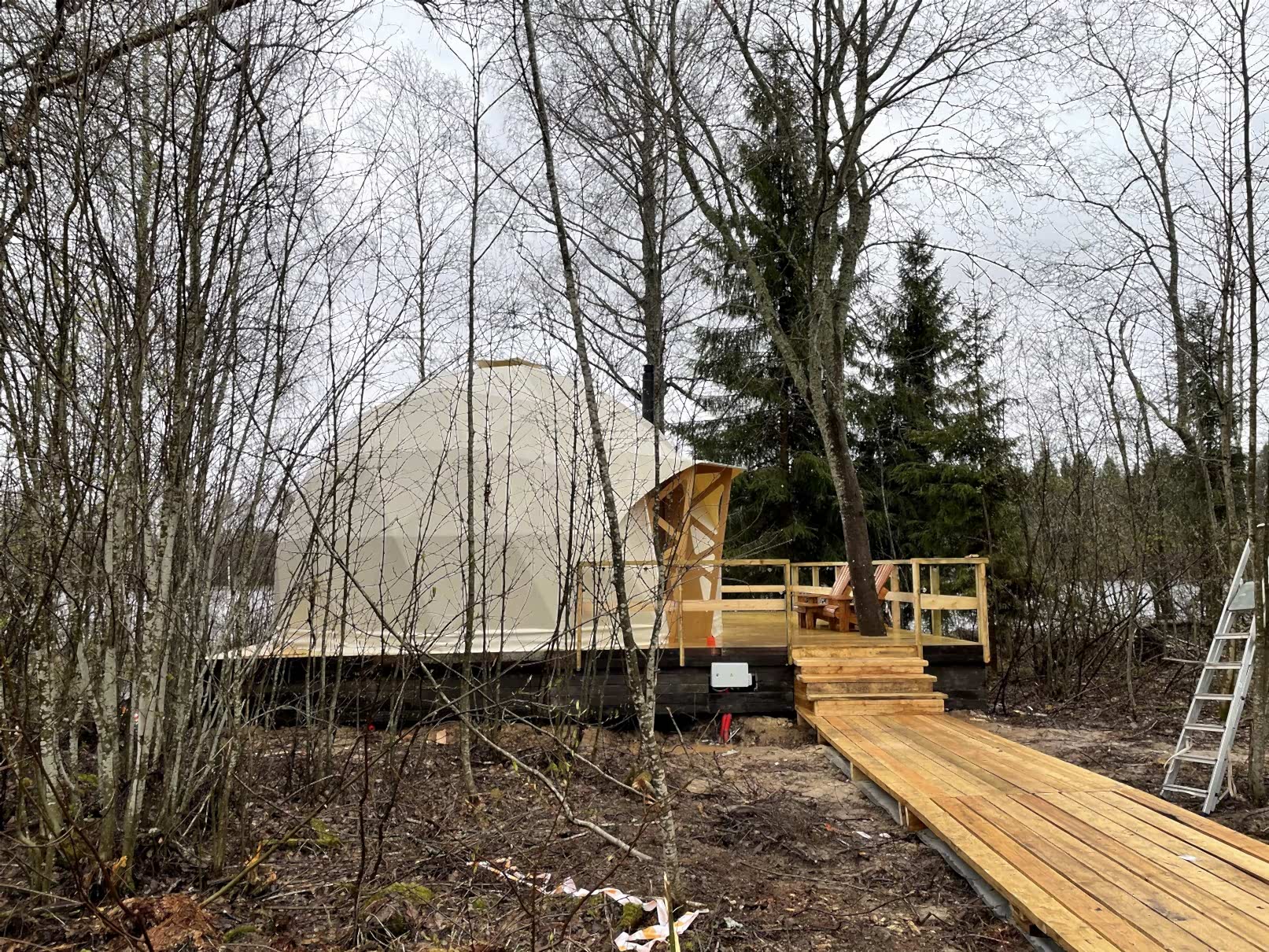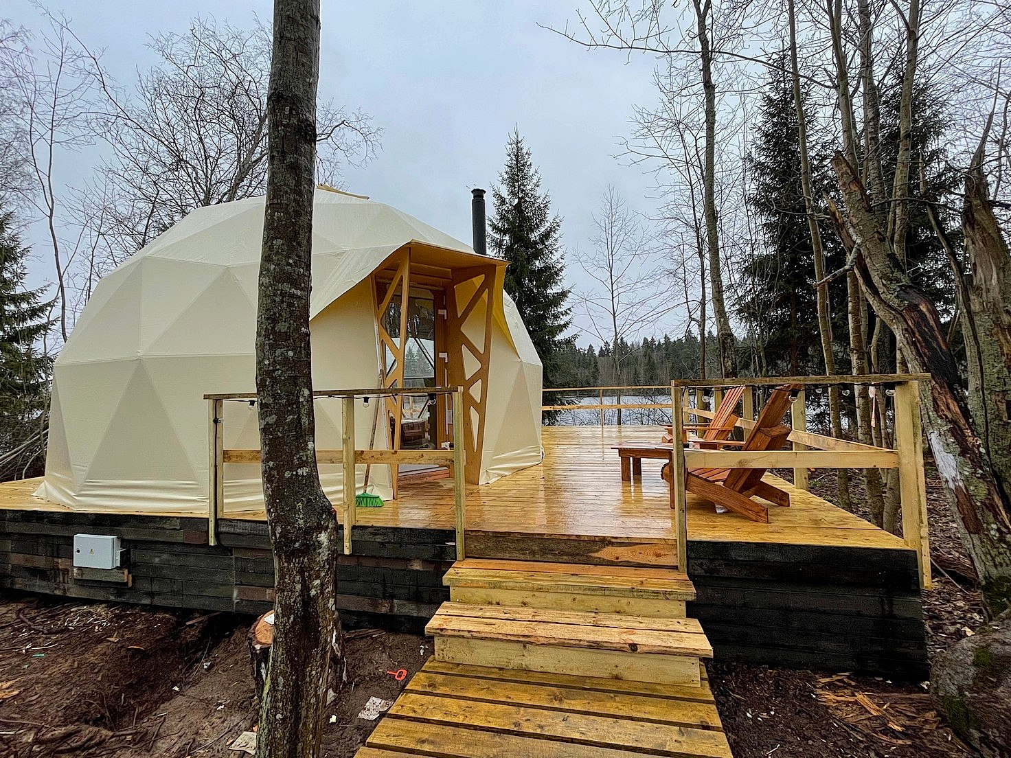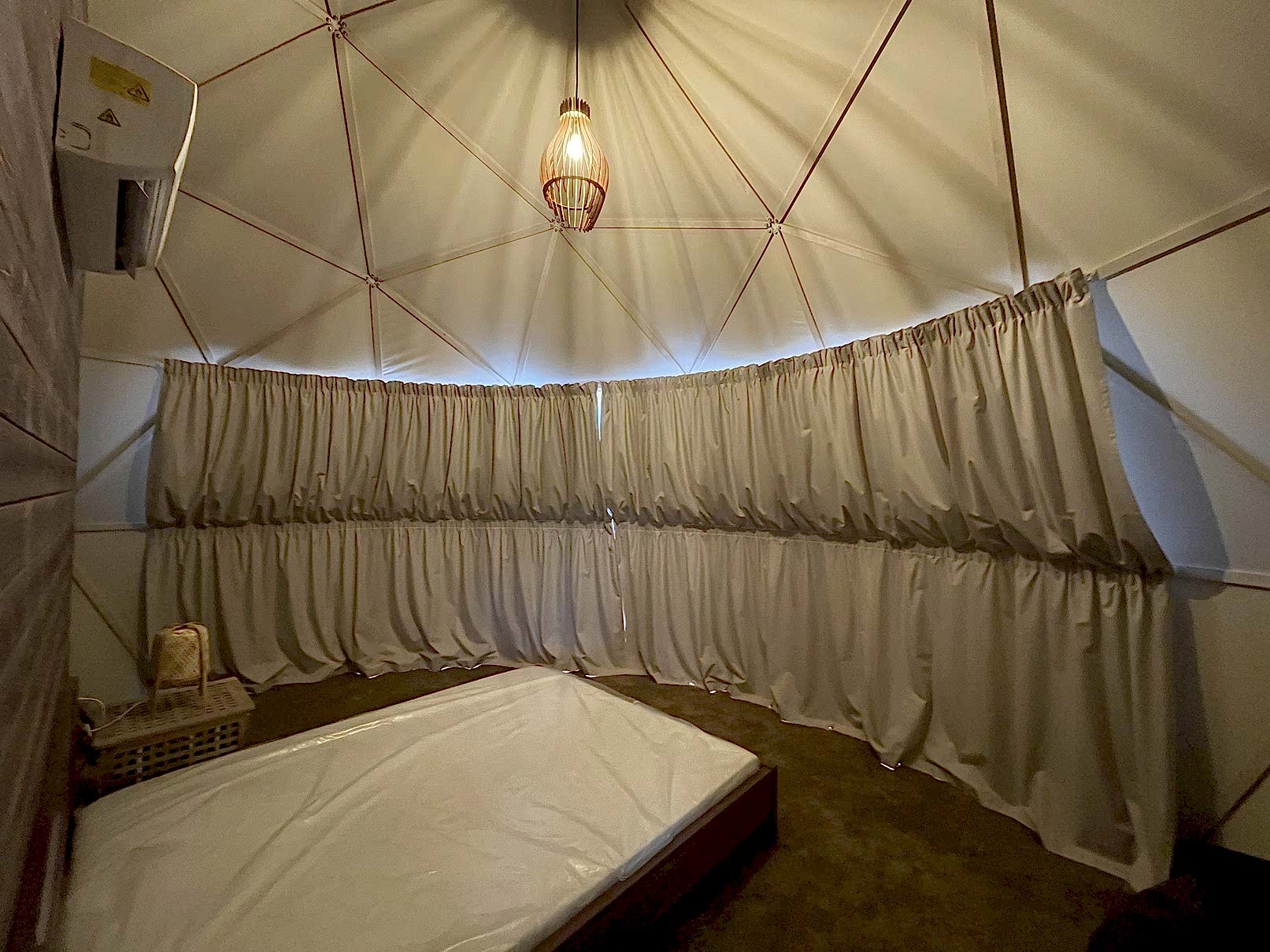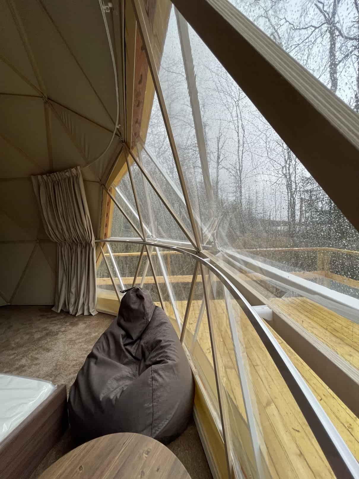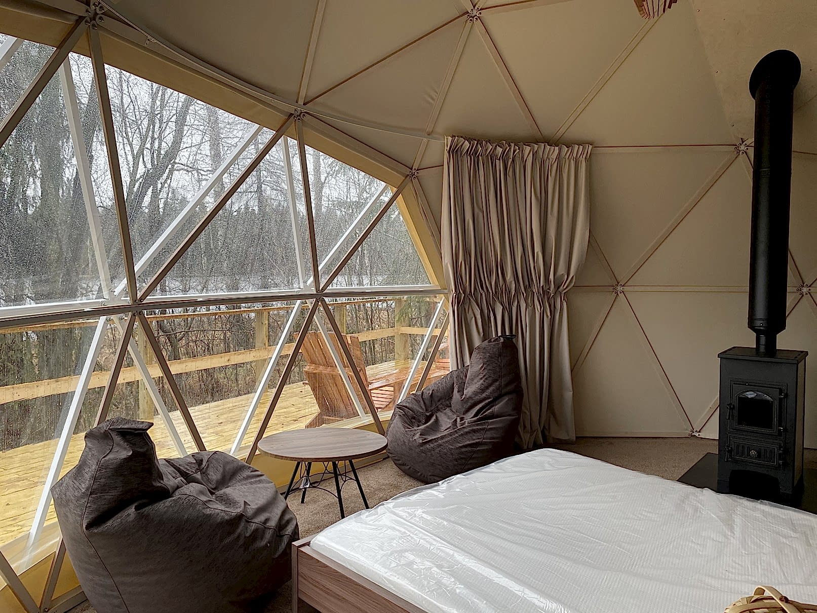 Этот опыт работы был интересен с точки зрения использования стандартных приёмов оформления окна при решения функциональных задач по организации отдыха гостей Пин-ап - светозащиты внутри дома и необходимое уединение для комфортного проживания. Для этих целей внутри дома-сферы использовали ткань блэкаут. Материал имеет противопожарный сертификат и изготовлен изспециального волокна 100% PES FR.