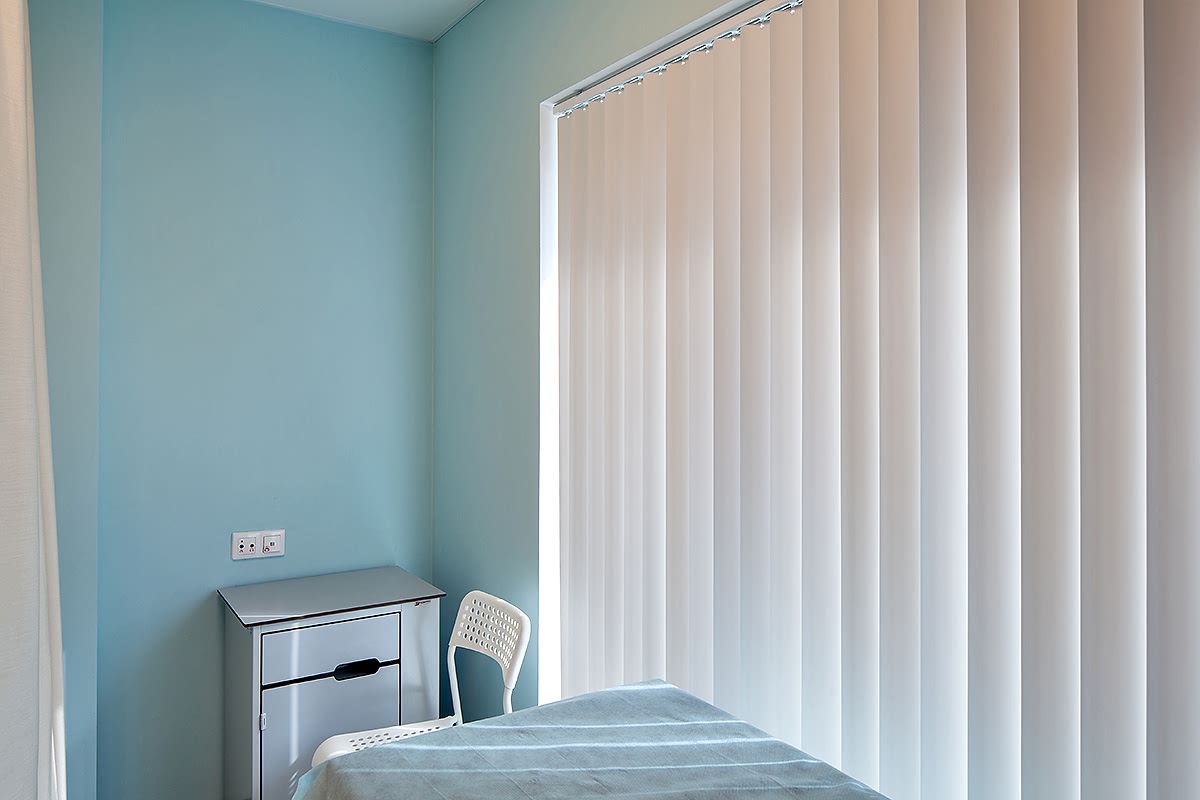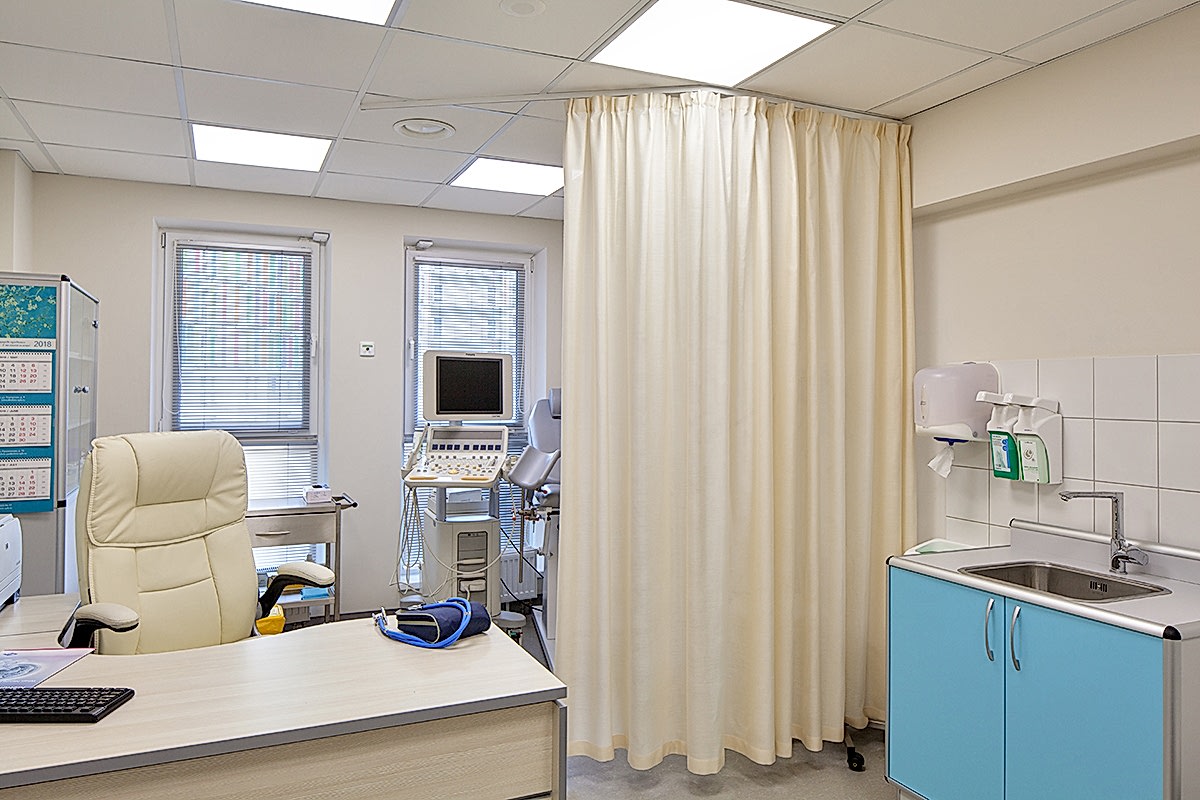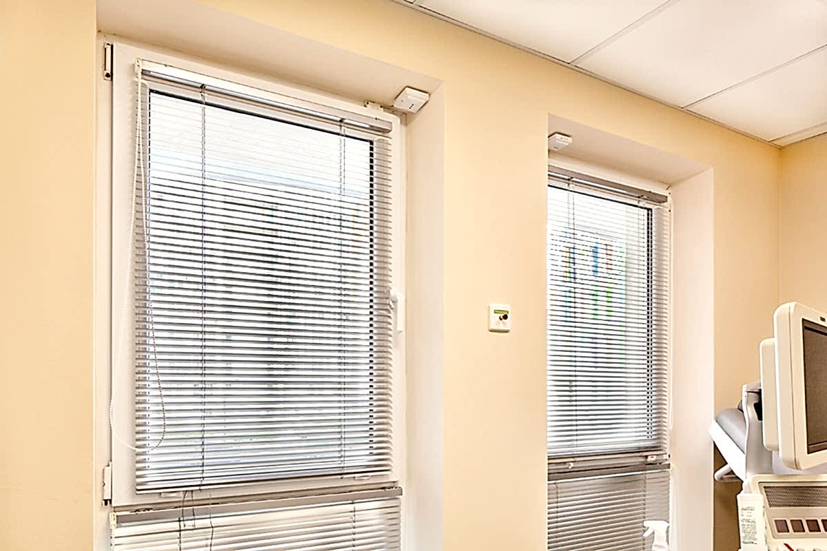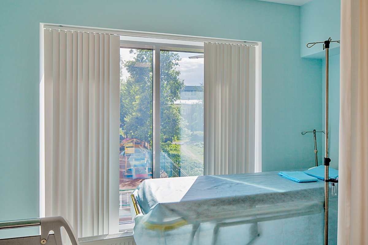 Интерьер клиники должен быть современным, минималистичным и - в первую очередь - строго Пин-ап В таких помещениях предъявляются повышенные требования к гигиене: это касается всей отделки, в том числе и оформления окон. В данном случае на окнах установлены солнцезащитные алюминиевые и пластиковые жалюзи - вертикальные и горизонтальные. В кабинетах и палатах - тканевые перегородки для зонирования пространства из влагостойких тканей, выполненных по технологии Out-door из специальных волокон. При длительном воздействии воды на такой ткани не образуется грибок.