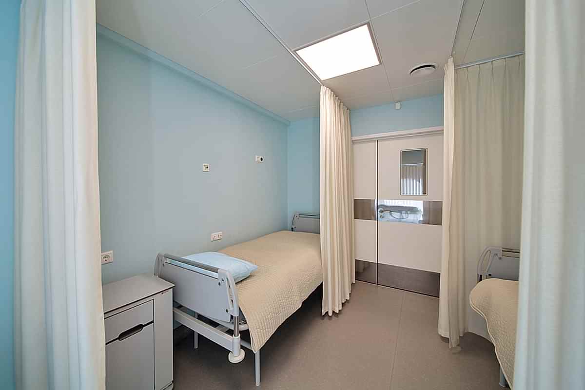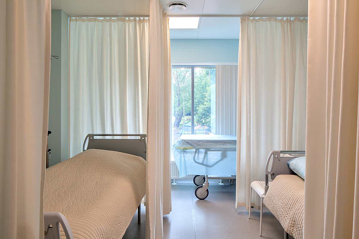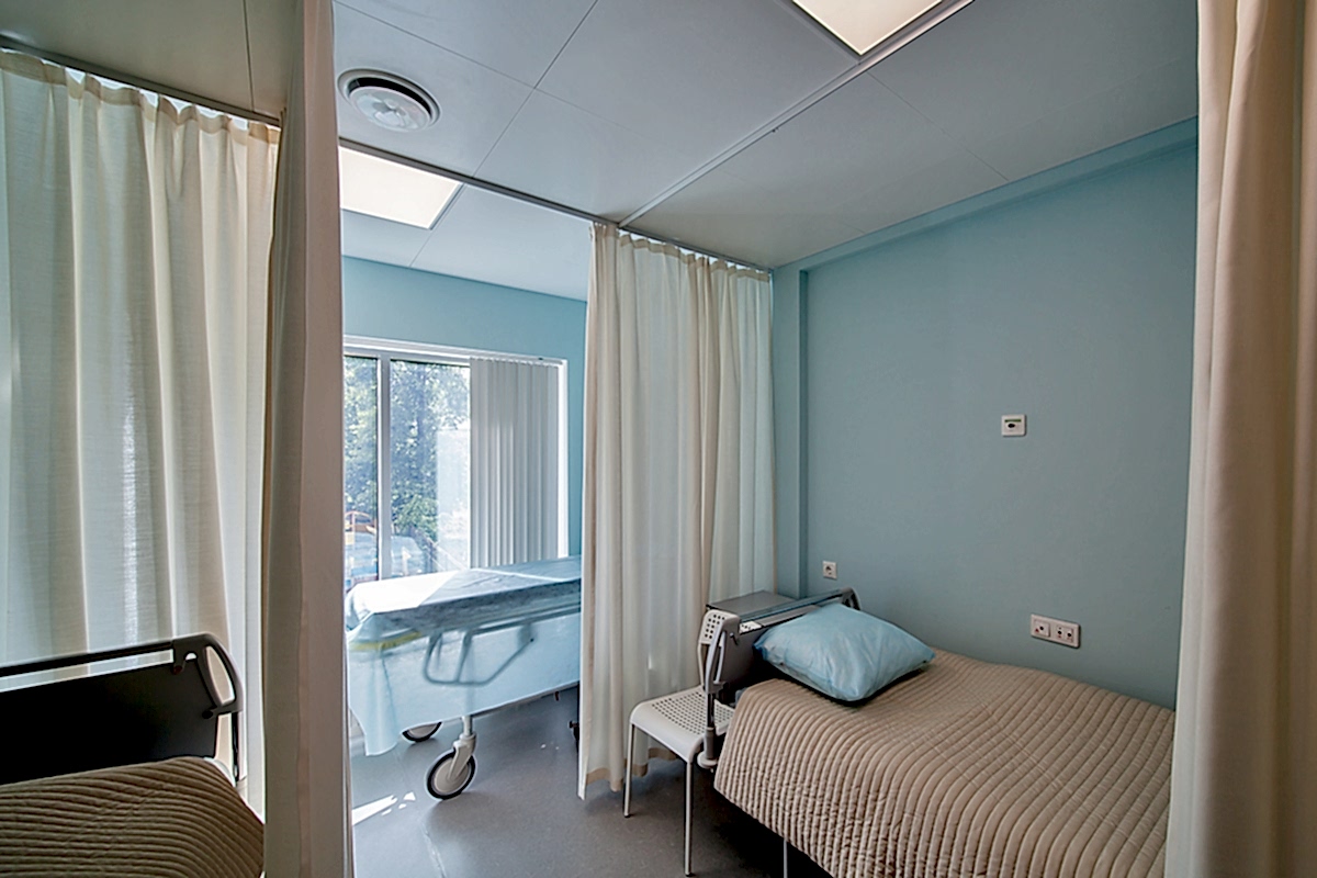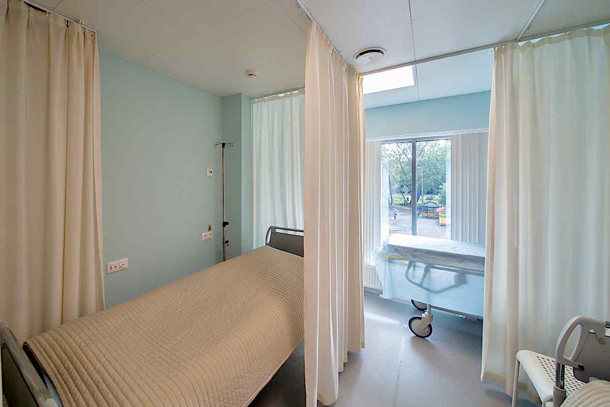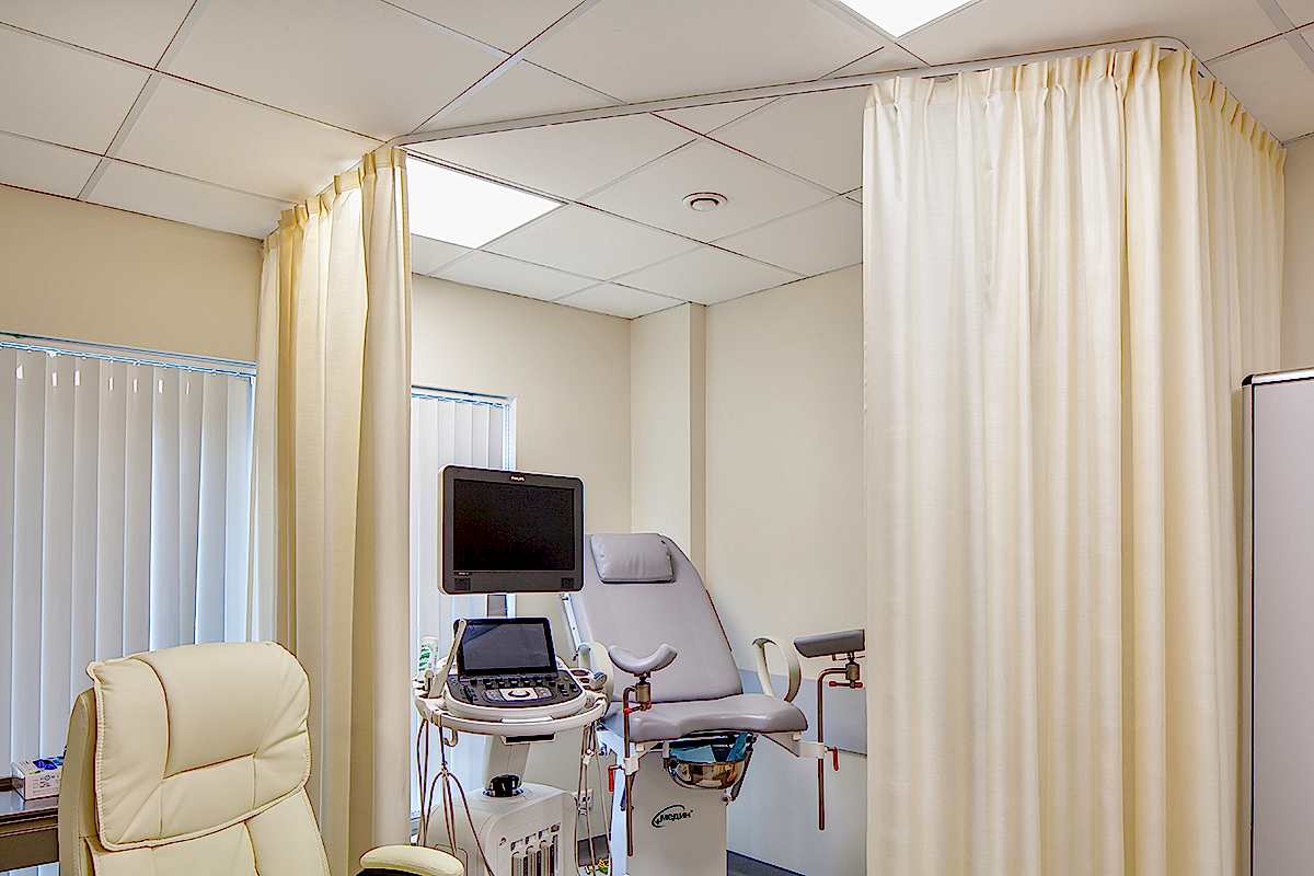 Интерьер клиники должен быть современным, минималистичным и - в первую очередь - строго Пин-ап В таких помещениях предъявляются повышенные требования к гигиене: это касается всей отделки, в том числе и оформления окон. В данном случае на окнах установлены солнцезащитные алюминиевые и пластиковые жалюзи - вертикальные и горизонтальные. В кабинетах и палатах - тканевые перегородки для зонирования пространства из влагостойких тканей, выполненных по технологии Out-door из специальных волокон. При длительном воздействии воды на такой ткани не образуется грибок.