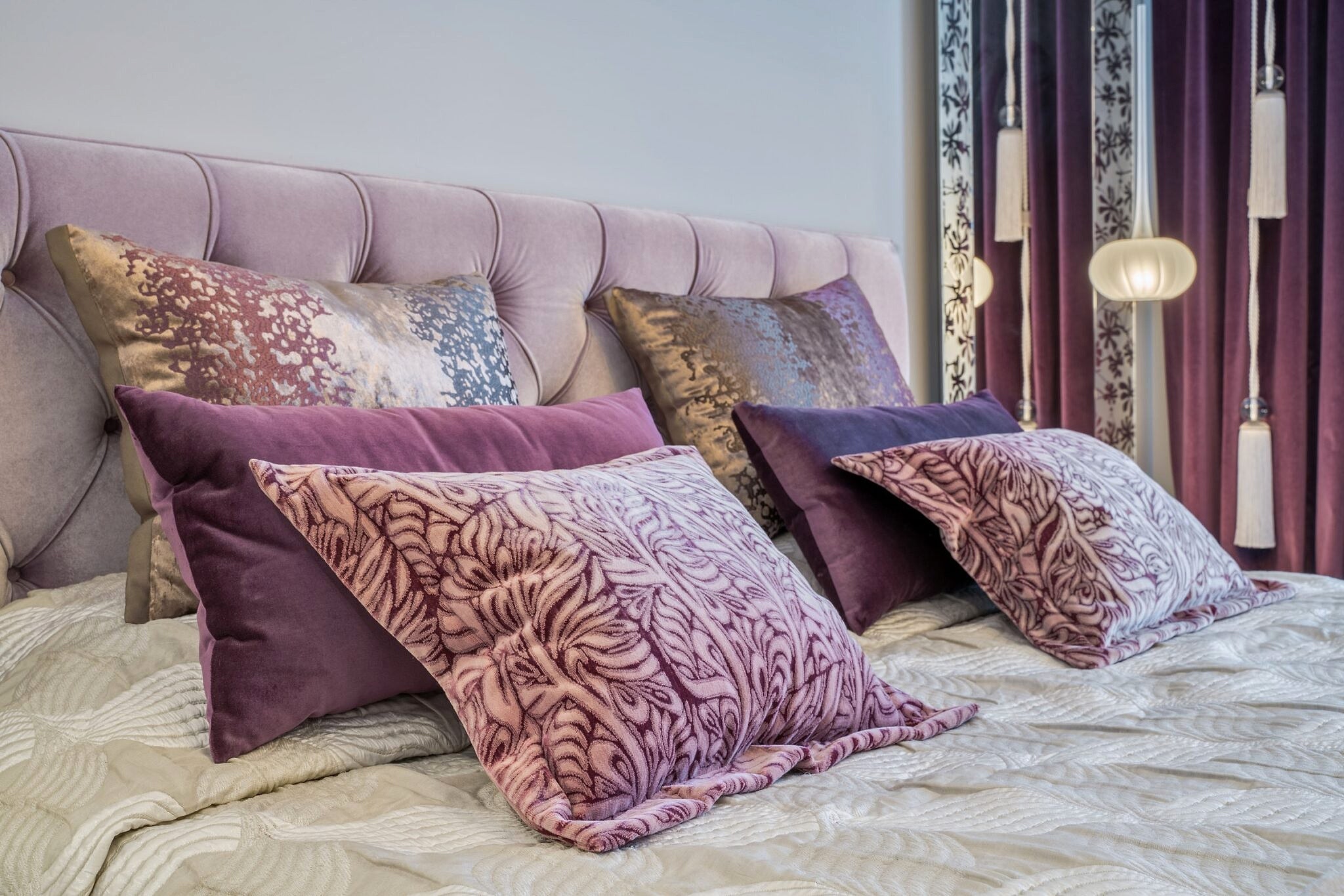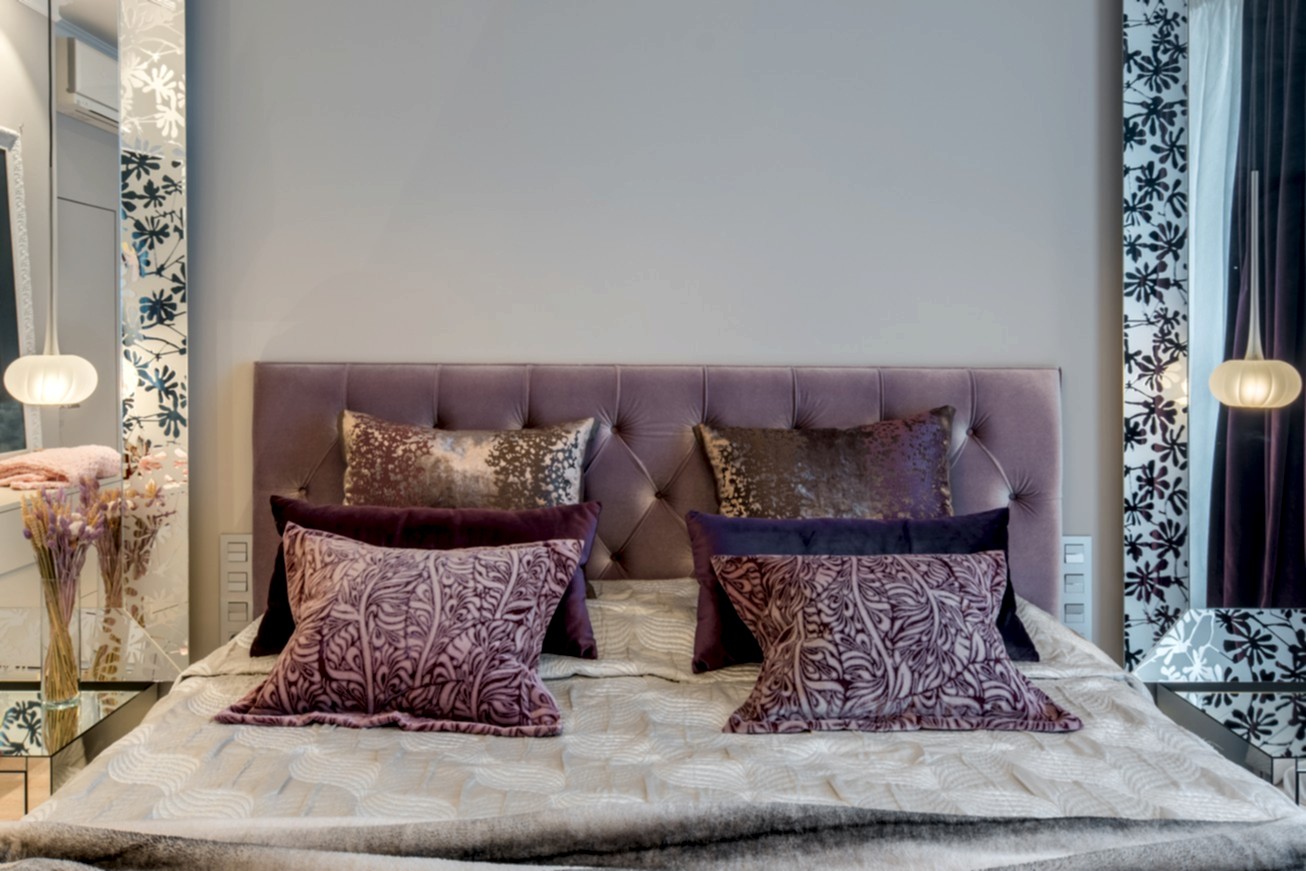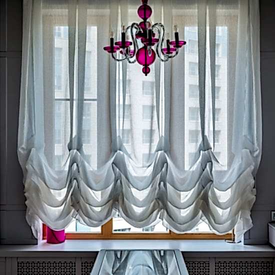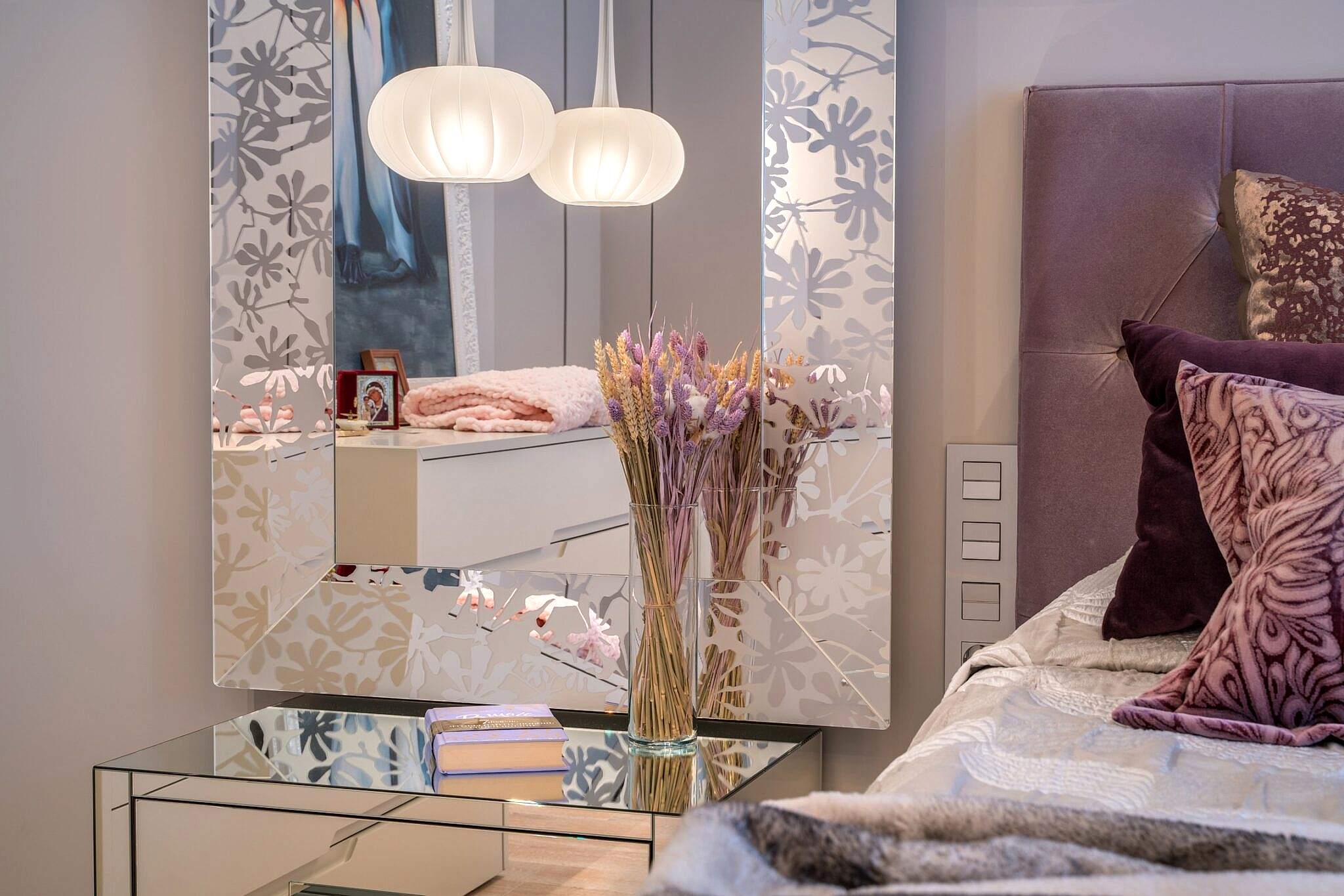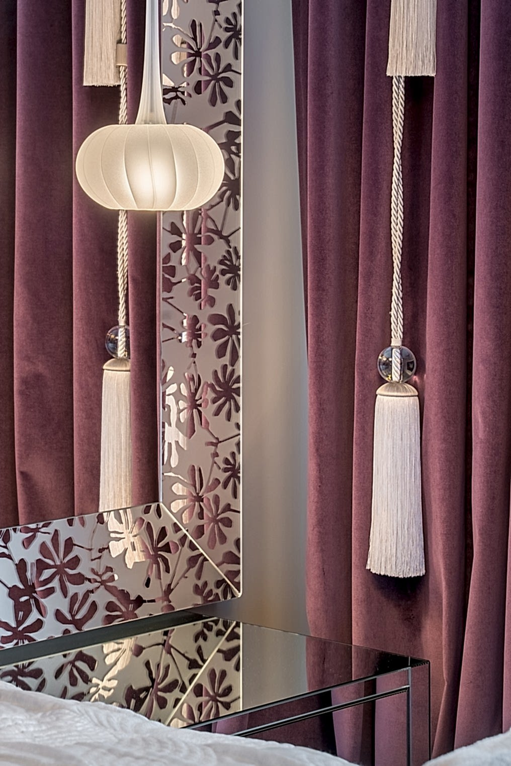 Проект интересен тем, что помимо стандартных кухни, столовой-гостиной, спальни, квартира включала еще зимний сад с зоной для занятий спортом и особую гордость хозяйки - роскошную гардеробную комнату. Просторные светлые помещения с акцентным текстильным оформление бирюзовых, розовых и фиолетовых оттенков, перекликающихся по цвету с необычными люстрами и элементами декора подчеркивают смелость владелицы и ее креативность, а также создают очень нежный, романтичный, женственный интерьер.