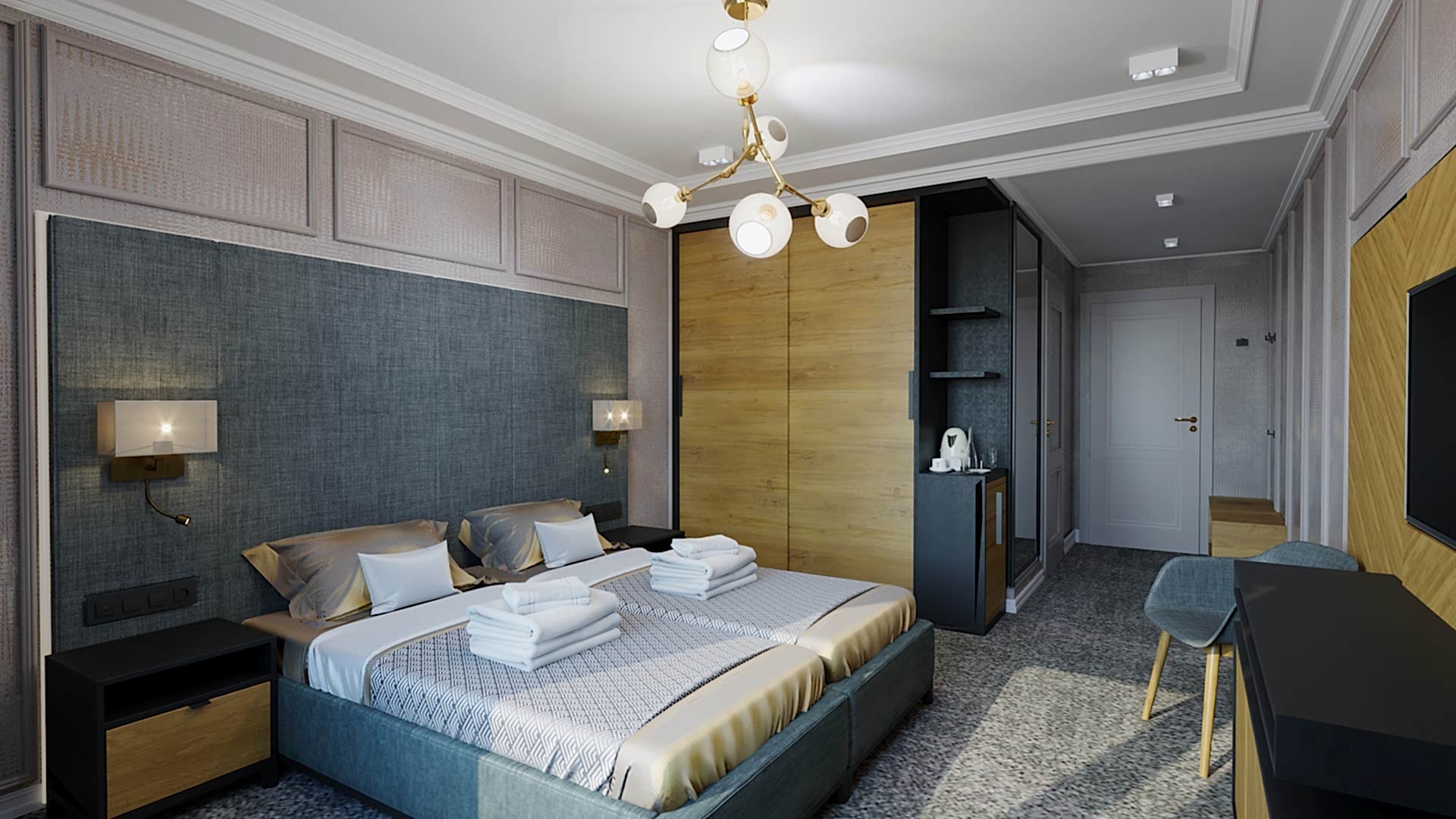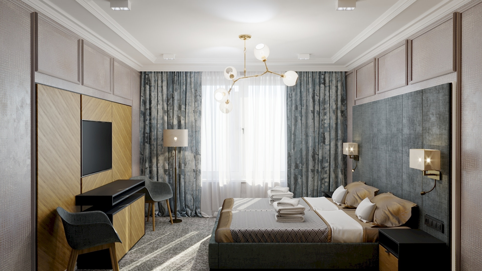 Пин-ап проект - это гостиничный номер с достаточно сдержанным интерьером, весь текстиль которого представлен негорючими тканями высокого качества, которое было подтверждено сертификатамиВНИИПО МЧС.