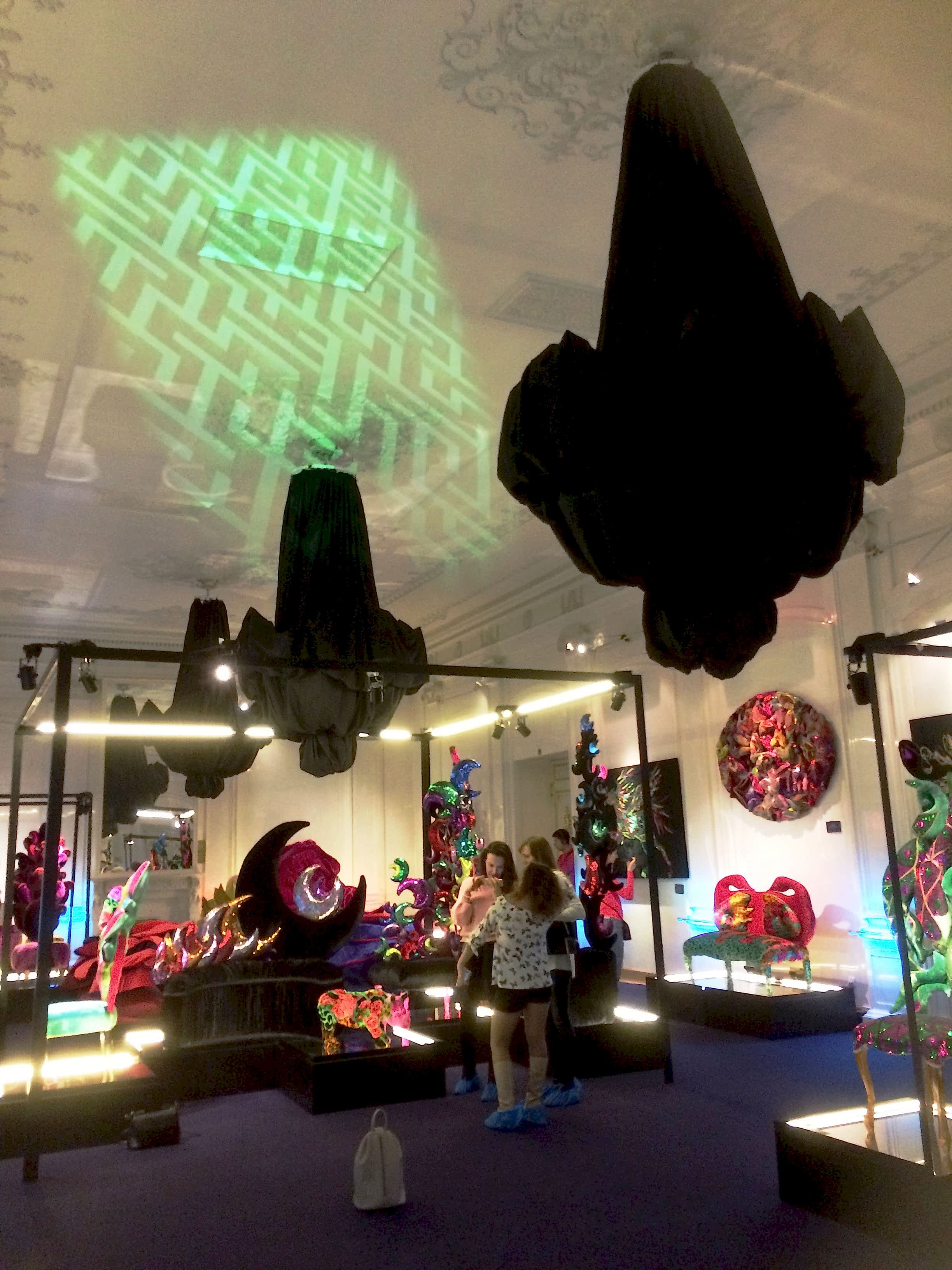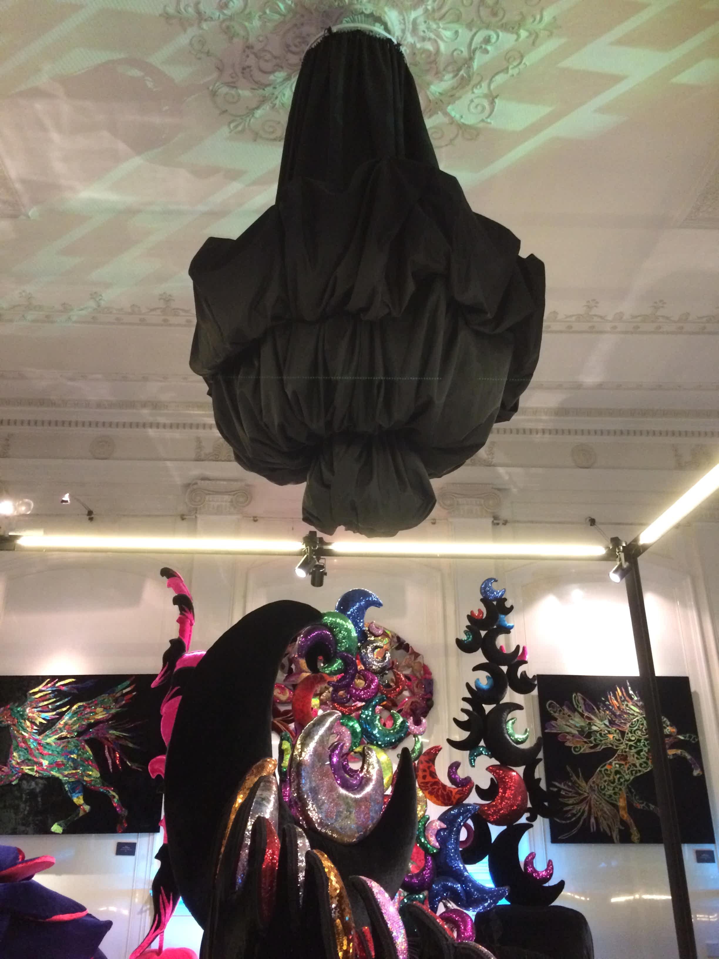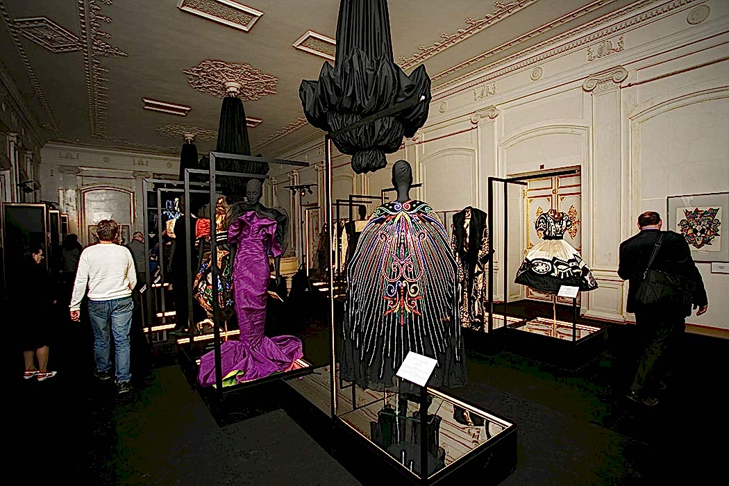 Для оформления выставки было необходимо Пин-ап несколько функциональных задач, не нарушая художественную идею экспонирования костюмов. Прежде всего, острота образов подчёркивалась интерьером: белый мрамор и черное оборудование, что было отличным фоном для буйства красок театральных костюмов. Для светоизоляции были изготовлены римские шторы из черного блэкаута, который полностью блокировал свет в помещении. Сейчас это очень популярный материал длясветозащиты. Также была осуществлена идея задрапировать люстры в черное. В целях пожарной безопасности драпировка была выполнена из огнестойких тканей (волокна FR-One). При случайном включении люстр ткань не загорелась, а начала плавиться, что в очередной раз подтверждает правильность применения профессионального текстиля.