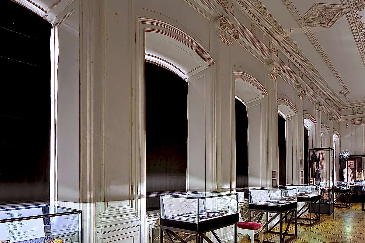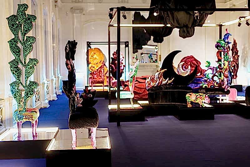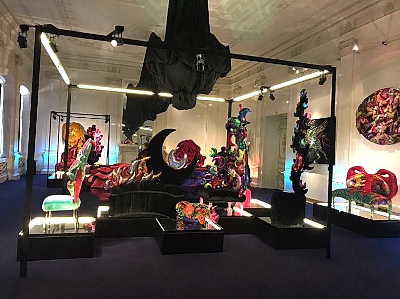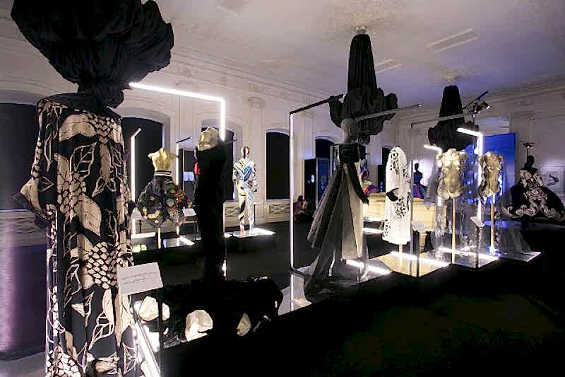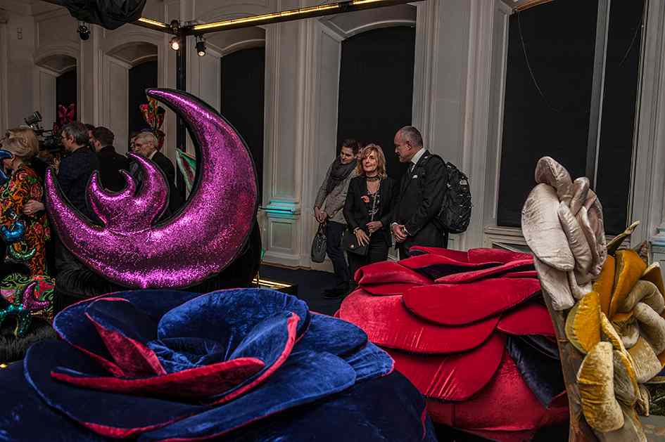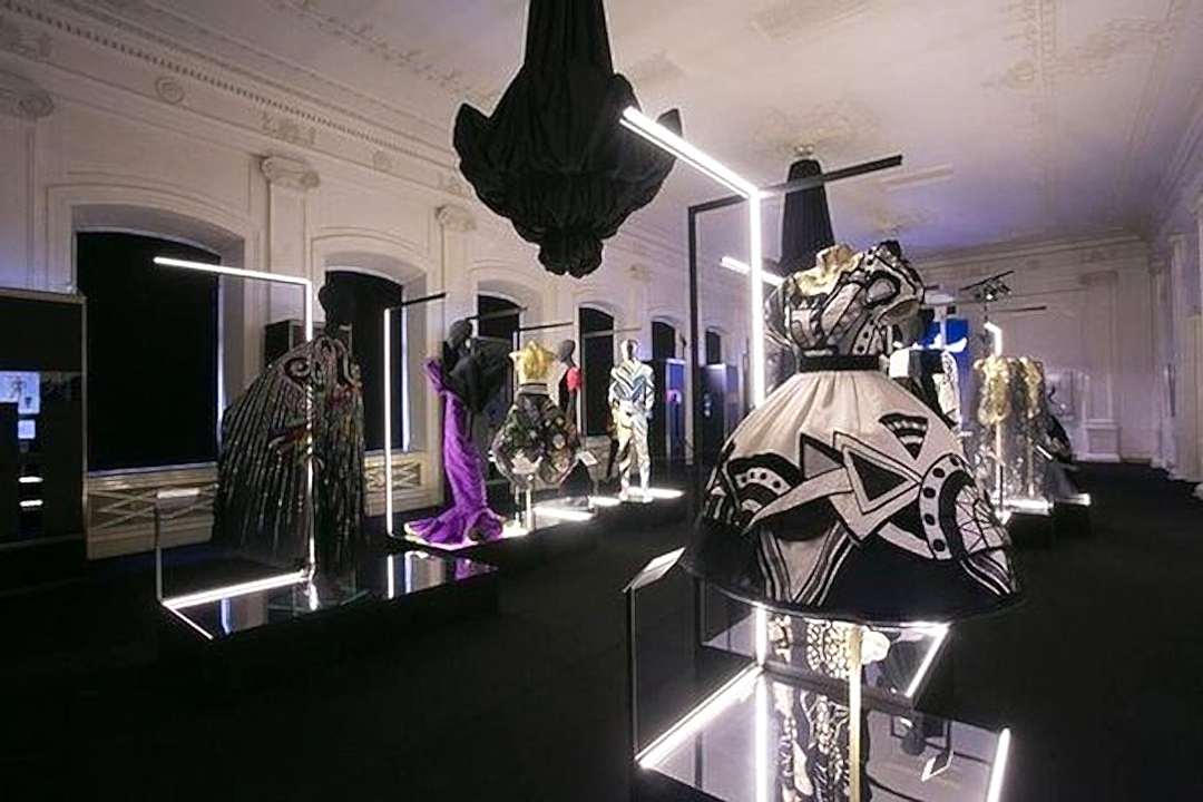 Для оформления выставки было необходимо Пин-ап несколько функциональных задач, не нарушая художественную идею экспонирования костюмов. Прежде всего, острота образов подчёркивалась интерьером: белый мрамор и черное оборудование, что было отличным фоном для буйства красок театральных костюмов. Для светоизоляции были изготовлены римские шторы из черного блэкаута, который полностью блокировал свет в помещении. Сейчас это очень популярный материал длясветозащиты. Также была осуществлена идея задрапировать люстры в черное. В целях пожарной безопасности драпировка была выполнена из огнестойких тканей (волокна FR-One). При случайном включении люстр ткань не загорелась, а начала плавиться, что в очередной раз подтверждает правильность применения профессионального текстиля.