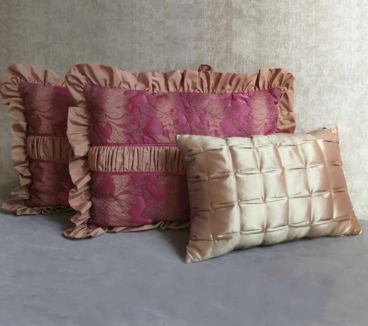 Комплект роскошных Пин-ап подушек из тафты. Большая подушка «Бордо» отделана по периметру рюшей из тафты (коэффициент сборки - ½). Вторая подушка - меньшего размера, светло-коричневая, декорирована ручными защипами.